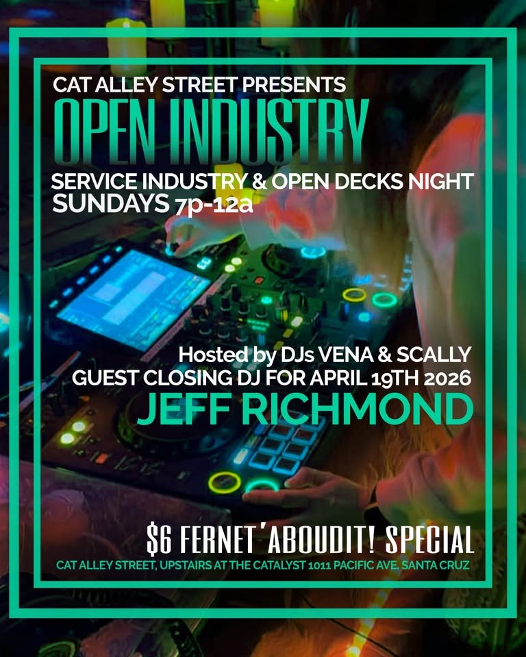 Open Industry at Cat Alley Street has got you covered. A service industry night and open decks DJ workshop every Sunday 7pm-close hosted By DJs Vena & Scally. With Guest DJ Jeff Richmond headlining the night!